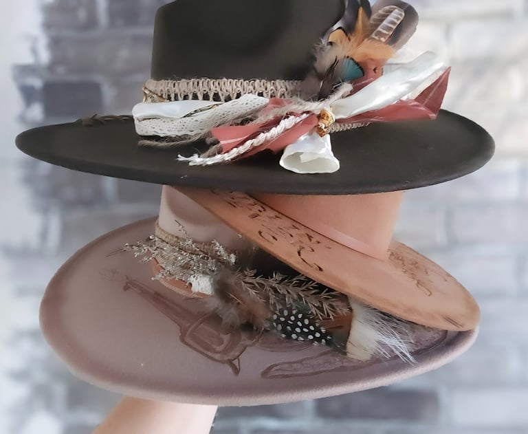 Looking for a way to express your unique personality at your next special occasion? Custom order your one-of-a-kind hat or select from redesigned clothing that complements any event, whether it's a concert, wedding, vacation, or party. Our hats & clothing are designed to showcase your individual style, ensuring that you stand out in a crowd. Choose from a variety of colors, designs, and embellishments to create a piece that is truly yours. Each hat is crafted with care, so you can be sure it will not only look great but will also be comfortable to wear.
